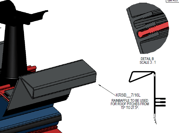 Rain Baffle also know as Rain Guard. The glazing material is pushed into a ‘pocket’ under the ridge to prevent wind driven rain. On this diagram the rain baffles are colouredgrey. KRB_7/16L Rain Baffle is used for roof pitches from 15 degrees to 27.5 degrees.
